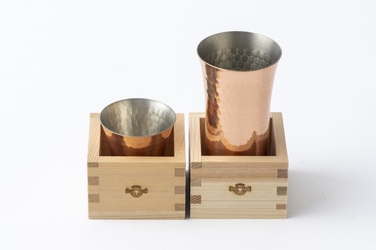 冷酒杯 左から、S 3,960円、L 4,290円純銅製の冷酒杯とヒノキ桝のセット。純銅の杯はイオンの効果で味が澄み、熱伝導率が高いので、冷酒の清涼感を手や唇で感じ取りやすいのが特長です。なみなみと注いで、ヒノキの桝まで溢れさせて贅沢に。