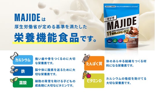 MAJIDE 1食(20g)に鉄分がほうれん草2束分、カルシウムが牛乳600ml分、身体のバランスや機能を正常に保つために必要な11種類のビタミンが含まれております。
