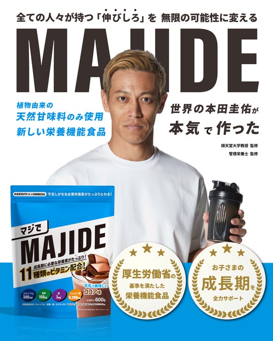 株式会社MAJIDE(本社:鹿児島県鹿児島市、代表取締役:松元康太郎)はサッカー界のレジェンド本田圭佑と共に開発した、幼児期・成長期に不足しがちな栄養素を補い、成長を促進する栄養機能食品「MAJIDE」を、2024年5月23日(木)より、AMAZON及び楽天の公式オンラインショップで発売開始致します。AMAZON:https://amzn.to/3yrxTUo