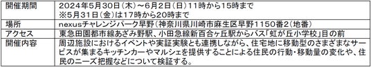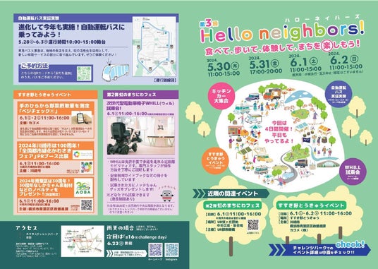 当社は、2024年5月30日(木)から6月2日(日)の4日間、第3回目となるミクストユースに向けた実証実験イベント「Hello neighbors! -食べて、歩いて、体験して、まちを楽しもう!-」(以下、本イベント)を東急田園都市線あざみ野駅からバスで約10分の郊外住宅地に位置するnexusチャレンジパーク早野(以下、チャレンジパーク)周辺地域で開催します。