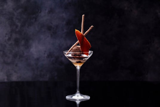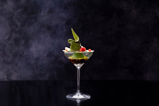 ほろ苦いダークチョコレートのブリュレにほんのり南国フルーツの甘さを感じさせるカカオパルプのジュレやチョコレートアイスクリーム、コーヒーゼリーなどが層をなした「ナイトショコラ」(¥2,800)はまったりと夜の余韻を楽しむお供におすすめです。トッピングされたカリカリのチュイルやメレンゲを崩しながらチョコレートとコーヒーが織りなす深みのある余味をゆったりとお楽しみいただけます。エスプレッソマティーニやカフェラテマティーニ、ウィスキーなどのハードリカーとの相性もよい一品です。