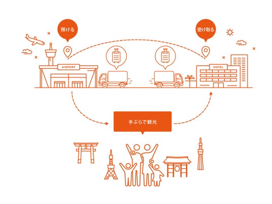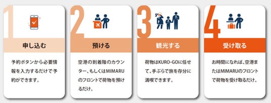 「KURO-GO」第一弾は、「MIMARU」の宿泊ゲストからご要望の多かった“手荷物当日配送サービス”に決定。「MIMARU東京?羽田・成田空港間」の手荷物を当日配送することで、荷物の多い入国・帰国時やお子さまと一緒の電車移動、観光地での滞在を身がるにし、快適な移動をサポートします。また、手ぶら旅を推奨することで、街なかや交通機関の混雑緩和にも貢献します。