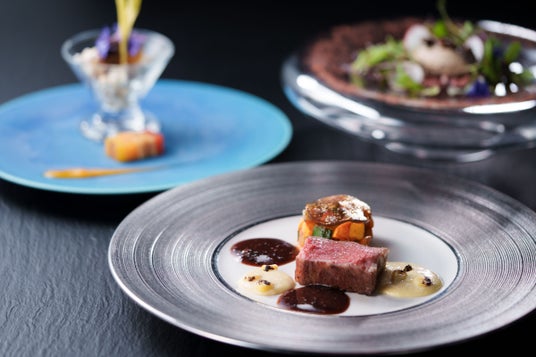 毎年夏に、北陸地方の白海老を使ったコースを展開してきた当ホテル。今年は東北の地から、お隣に位置する北陸地方にエールを送りたいという想いを込めて、北陸地方の食の魅力にフォーカスした全7品を揃えました。冷前菜は、能登牛のランプ肉と夏野菜を合わせたタルタル。幻の和牛とも称され、自然豊かな里山で大切に育てられた能登牛の繊細な味わいを、爽やかな紫蘇のソースが引き立てます。レモンが香る温前菜は、富山県で水揚げされた赤イカと蝦夷アワビのムニエル。肉料理は、能登牛のサーロインを香ばしくグリルし、トップにビーフコンソメのゼリーと金粉をあしらった、ハレの日にも相応しい雅な一皿です。能登牛らしい、きめ細やかで柔らかな赤身の肉質と、上品な脂のバランスをお楽しみください。その他、富山県の白海老のチュイルを添えた山形県産の秘伝豆のブルーテ、能登の海のミネラルが凝縮されたサイダーに瑞々しい桃を浮かべたピーチメルバなど、北陸の山海の幸を心ゆくまでお楽しみいただけます。
