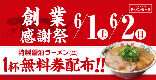 これを記念し、6月1日(土)~2日(日)の2日間限定でこれまでご愛顧くださったお客様へ感謝の気持ちを込めて、ラーメン1杯ご注文につき「特製醤油ラーメン(並)1杯無料券」*を配布いたします。