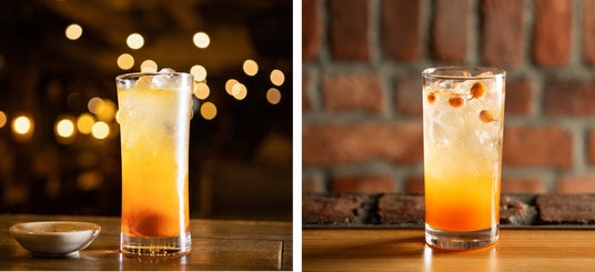 (左)シーベリーサワー、(右)シーベリーソーダこのほかにも、果実入りで優しい酸味のシーベリーサワー(680円)やノンアルコールのシーベリーソーダ(550円)をご用意しています。