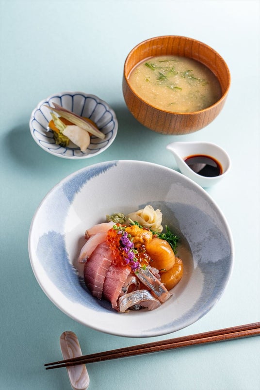旬のお魚は炭火で風味良く、利休焼きに、ほんのり温かな酢飯に卵黄などを合わせ、黄金シャリに仕上げました。炭火の香ばしさと胡麻の風味、黄金シャリの甘味、いくらのアクセントが、相交わる”温かい”海鮮丼をご賞味ください。