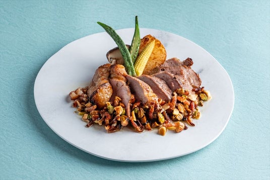 国産豚肩ロース肉の炭焼き ピスタチオとナッツのザクザクソース 2,000円