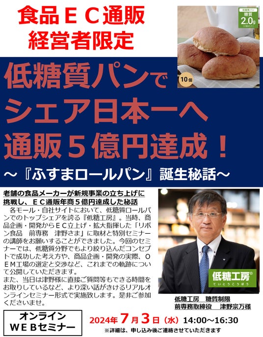 地方老舗食品メーカーの新事業責任者として数々の失敗を経て、2009年に少しづつ話題になり始めていた低糖質マーケットへ「低糖質パン」事業を立ち上げる。大手企業もなかなか成功していない中、EC通販に特化した事業戦略により、一気に売上を拡大。2020年にはすでにECだけで5億円以上に成長させた。今回いままで外部での講演がなかった「低糖工房」の津野様にご講演いただくことになった。今回セミナーでご講演いただく、津野様が立ち上げた「低糖工房」(https://www.teitoukoubou.com/)は、一般的なロールパンの売価が3倍以上の価格差でありながら、圧倒的な顧客の支持を受け、楽天などのECモールでシェア40%確保するなどの成長を見せた。その後も、食パン・ベーグルなどのパンマーケットの拡大により、モール内部のパンマーケットでもシェアトップを達成し、低糖質スイーツ、低糖質惣菜などのカテゴリーをふかしていき、競合他社も増えながらも、一定のポジションを確立されている。※現在、津野様は2024年にリボン食品様を退職されている。今回、地方老舗メーカーのチャレンジとして、新業界・新ブランド「低糖工房」を立上げ、業界トップクラスに成長させたリボン食品株式会社の前専務取締役の津野様に特別にご講演をしていただけることになりました。