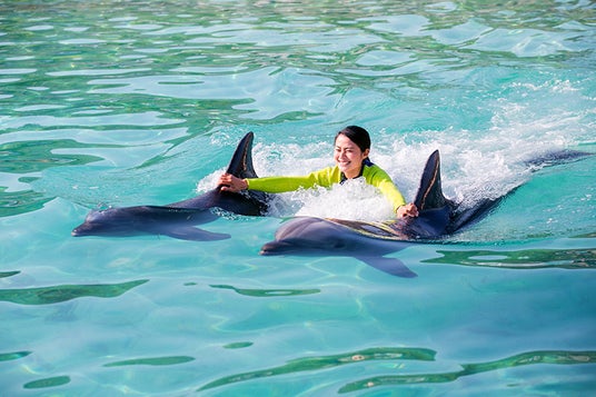 身長110cm以上で泳げる方はイルカにつかまって泳げます。