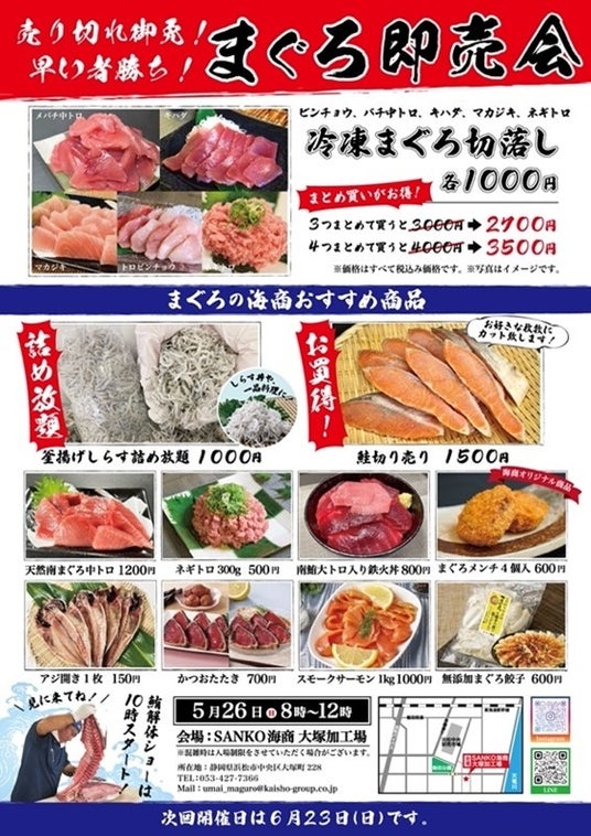 即売会では、ビンチョウマグロ、バチマグロ、キハダマグロなどの冷凍まぐろ切り落とし各種はもとより、大人気の「詰め放題」企画で「釜揚げしらす」をご提供いたします。そのほかにも、名物の「まぐろメンチ」などのお買い得品を販売いたしますので、お見逃しなく!