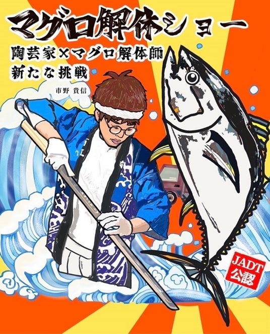 本イベントで解体ショーを行うのは、一般社団法人全国鮪解体師協会(JADT)公認解体師。まぐろの品質や衛生管理の知識を持ち、口上や切り方など見せる技術にも長けた解体師が安心・安全に配慮しながら、解体前には捌かれるまぐろの重量をお客様に予想していただくクイズ大会があるなど、エンターテイメント性のあるショーとして、お子様にもお楽しみいただける内容です。そして、今回の「まぐろ解体ショー」にはスペシャルゲストとして陶芸家でありながら1級鮪解体師資格の肩書きも持つ市野貴信さんが登場します。会場では陶芸作品の展示・販売もあり、鮮やかな包丁さばきとともに異色の解体師・市野さんのショーを皆様にお届けします。