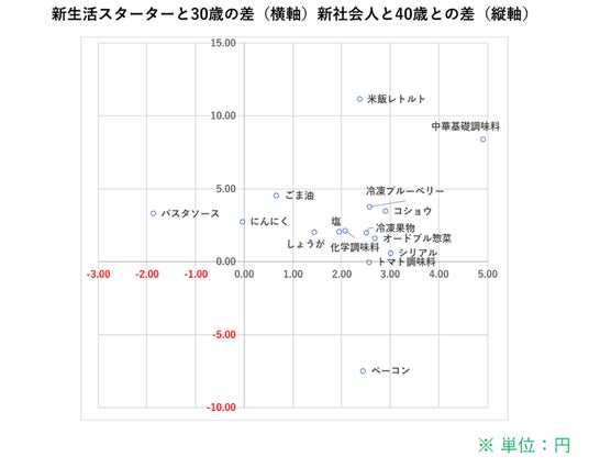 2024年4月における新生活スターターと30歳・40歳の購入金額差を分析すると(図1)、購入食品ジャンルに違いがあることがわかります。30歳・40歳よりも多く購入されている商品のトップに「パックご飯」などを含む「米飯レトルト」が確認できます。食生活の多様化などからコメ離れが進んでいる中でも、時短で食べられるパックご飯市場は拡大しているともいわれていますが、今回の分析では特に新生活スターターの購入金額が高いことがわかり需要の高さがうかがえます。