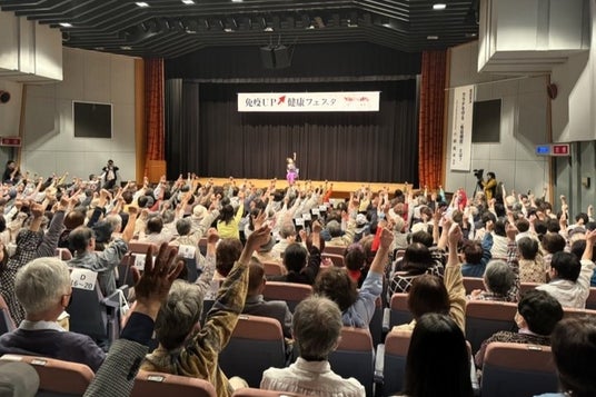 基調講演では、京都大学国際高等教育院 特定教授 小柳 義夫先生に、「カラダを守る『免疫機能』とは?」をテーマにご講演いただきました。私たちの体に備わる免疫機能と消化管である腸の役割、ヒトにとって有用な微生物が、腸内フローラのバランスを保ち、免疫機能の維持に重要であることを解説。免疫機能を高める生活習慣には、バランスのよい食事、適度な運動、十分な睡眠、乳酸菌摂取で腸の元気を保つなど、健康を維持する秘訣について教えていただきました。ステージイベントでは、チェアトレーニングインストラクター 渡邊 良美さんによる座ったままで行える簡単エクササイズ「チェアトレーニング」を体験。会場が一体となり、楽しく体を動かし、汗を流してリフレッシュする時間となりました。テノール歌手で噺家でもあるケーシーハシモトさんによるミニコンサートでは、観客の心揺さぶる素敵な歌声を披露いただきました。