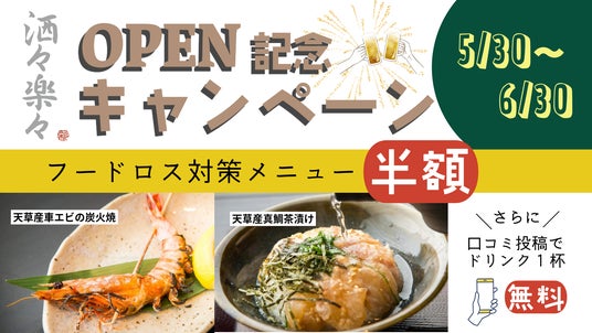 それを記念して5/30より、「天草産車エビの炭火焼」「天草産真鯛茶漬け」を通常価格の半額でご提供。さらに、口コミを投稿したお客様にドリンク1杯をプレゼントするキャンペーンを実施します。