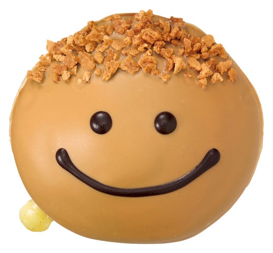 『キャラメル スマイル カスタード』は、感謝の気持ちを笑顔で伝えるドーナツです。卵の風味を感じる濃厚なカスタードクリームを詰めた生地に、香ばしいキャラメルコーティングを重ね、ビターチョコで優しい笑顔を描きました。トッピングのアーモンドクランチでチャーミングなヘアスタイルを表現し、見た目と味わいにアクセントを加えています。