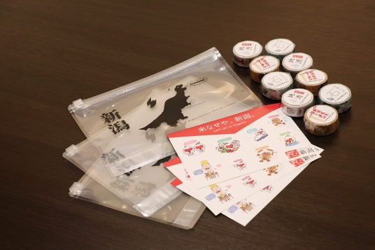 ノベルティイメージフェア期間中にランチの新潟フェア対象メインメニューをご利用の方に、オリジナルマスキングテープやジップルパックを先着80名様、小学生以下のお子様には新潟のご当地キャラ入りステッカーをプレゼントいたします。プレゼントは数に限りがございます。無くなり次第、プレゼント終了となります。また、プレゼント内容をお選びいただくことはできません。予めご了承ください。