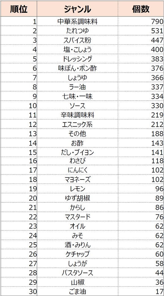 調味料の種類別ランキングでは、中華調味料が最も多く、次いでたれつゆ、スパイス粉という順位になりました。