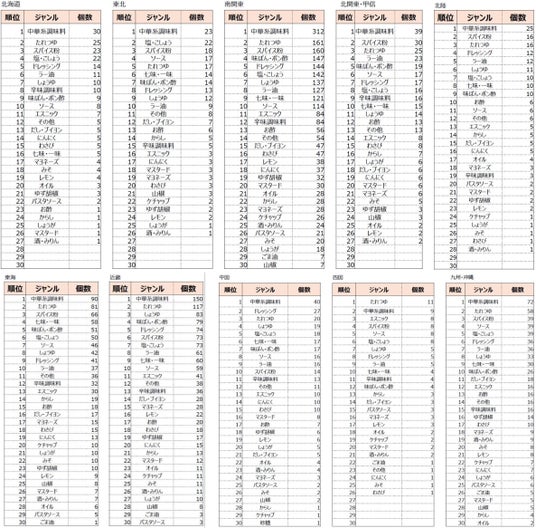 どのエリアでもダントツのトップが中華調系味料だが、県別で見ることで「中華街がある→中華系調味料を使う頻度が高い」ことが証明されるかもしれません。