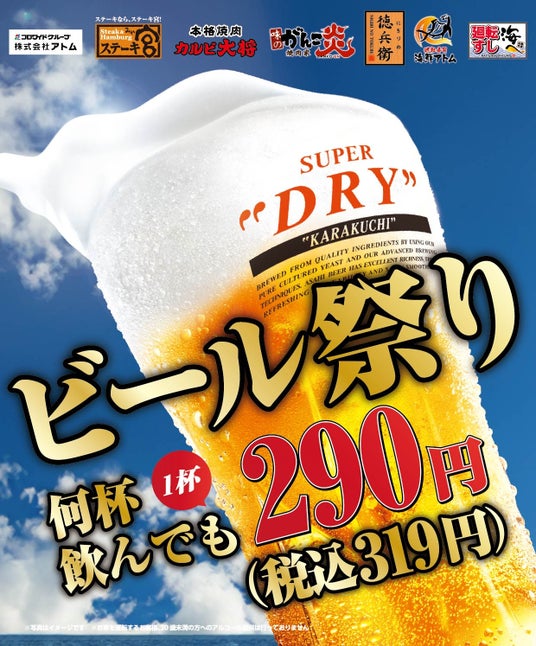 ステーキ宮、カルビ大将、にぎりの徳兵衛をはじめとするアトム6ブランド計225店舗で、生ビール、サワーなどが1杯290円(税込319円)で楽しめる超お得な「生ビール」祭りを開催します!