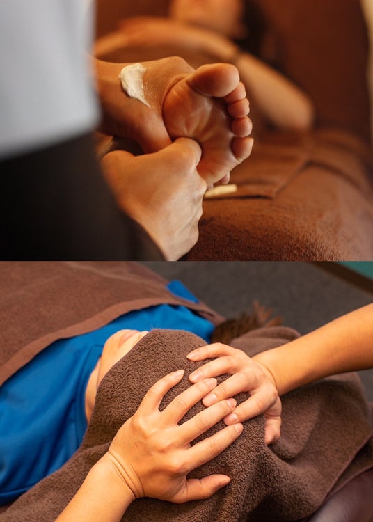 ゆっくり丁寧に反射区を痛気持ち良い絶妙な強さで押して足の疲れ、浮腫みはもちろん内臓の活性化にも効く施術です。冷え性の改善も期待できるため、サウナ前後に施術を受ける事でより一層体が温まります。【ヘッドマッサージ】