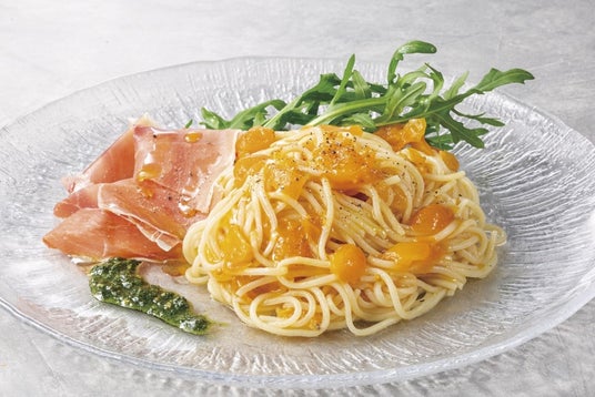 「黄色いトマトの冷製スパゲッティ」甘味が強くフルーティな味わいのイタリア産の黄色いトマトと、イタリアの塩のみで仕上げたソースをバジルのソースや生ハムと一緒に頬張れば、口いっぱいに冷たさと旨みが広がります。