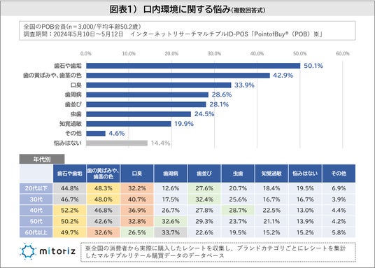 ・口内環境の悩みは「歯石や歯垢」が50%超え、30代以下は見た目悩み。口臭は30代のみ40%を超える