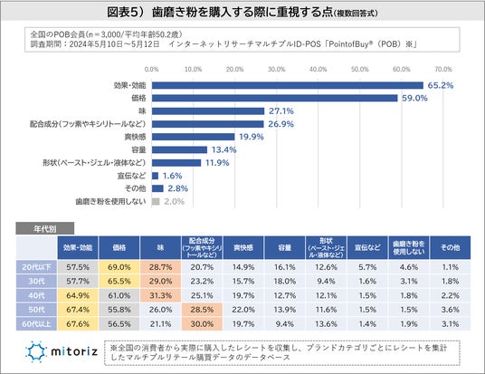歯磨き粉を購入する際に30代以下は「価格」、40代以上は「効果・効能」を重視