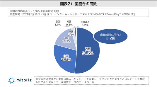 1日の歯磨き回数は「2回」が51.5%で過半数超え、全体の平均は2.2回