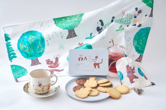 夏の新作『どうぶつたちのクッキー缶 “COOKIE TIME”』をはじめ、『クッキーとハーブティーの巾着セット』や『数量限定カップソーサー付き!スペシャルコンプリートセット』など、動物たちの「クッキータイム」をテーマにした絵本のようなお菓子グッズを全4種、新発売します。素材と工程にこだわり一枚一枚丁寧に焼き上げたコク深いクッキーと共に、よしのちはるさんとフェアリーケーキフェアが描く心ほどける物語をお楽しみください。