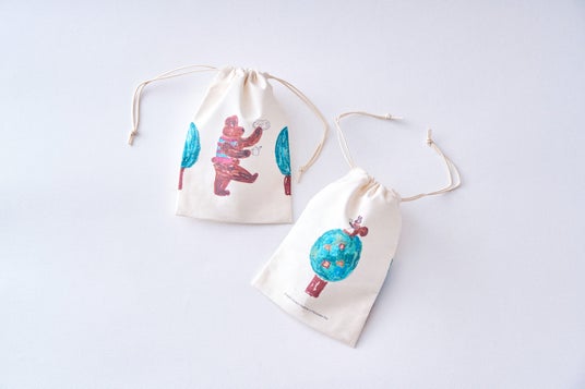 巾着のオモテには紅茶を運ぶクマ、ウラには木の上でクッキーを楽しむリスが描かれています。