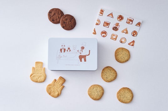 パッケージに描かれた動物たちのクッキーづくりをモチーフに、その物語と連動したオリジナルクッキー缶が登場。よしのさんが描いたシェフネコの型抜きクッキー「発酵バタークッキー」と、絵のなかで動物たちが作るまんまるクッキー「ショコラクッキー」「アールグレイクッキー」をアソートしました。紅茶やハーブティーにも相性抜群!ほっと一息つく夏のティータイムにぴったりなひと缶です。