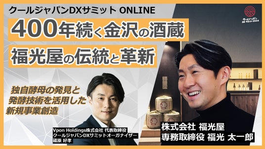 クールジャパンDXサミット実行委員会(運営事務局:Vpon JAPAN株式会社、本社:東京都新宿区、代表取締役社長/クールジャパンDXサミットオーガナイザー:篠原 好孝、以下Vpon JAPAN)は、「400年続く金沢の酒蔵 福光屋の伝統と革新 ~独自酵母の発見と発酵技術を活用した新規事業創造~」と題した特別対談を配信することをお知らせいたします。