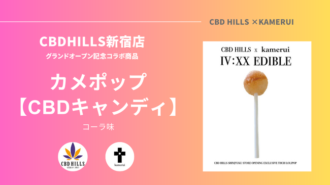 オープンを記念して、CBDブランドKamerui(カメルイ)とCBDHILLSの記念コラボ商品【CBDキャンディ】”カメポップ”(コーラ味)を発売開始いたしました。