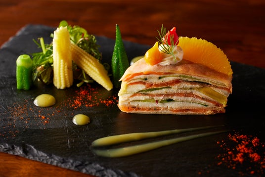 ・スモークサーモンと夏野菜のミルクレープ オレンジソース