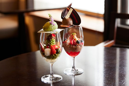 チョコレートの様々なテクスチャーとベリーの爽やかな酸味を楽しめるパフェ「ショコラベリーパフェ」や抹茶を贅沢に味わえる「京抹茶とショコラのパフェ」。