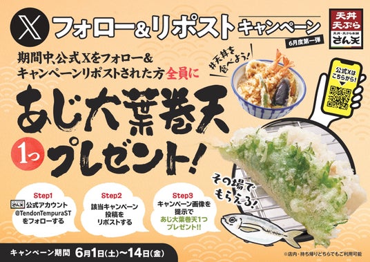 サトフードサービス株式会社(本社・大阪府大阪市、代表取締役社長・杉本 貴之)が運営する「天丼・天ぷら本舗 さん天 」では、2024年6月1日(土)~6月14日(金)まで、公式Xアカウントをフォローし、キャンペーン投稿をリポストすることで、「あじ大葉巻天」がその場でもらえるキャンペーンを期間限定で開催します。簡単に応募でき、期間中に何度でも「あじ大葉巻天」がもらえる大変お得なキャンペーンですのでぜひご利用ください。
