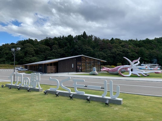 「イカの駅つくモール」は日本百景の九十九湾(つくもわん)に面した地にある観光交流センターです。能登の幸が味わえるレストランや能登町特産品を中心としたお土産コーナー、イカ漁の展示コーナーがあり、マリンレジャー関連施設も併設されています。全長13メートルの巨大なイカのモニュメント「イカキング」は、イカの口の中に入ったり触腕に巻き付くことができ、人気スポットとなっています。