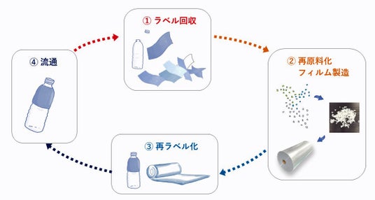 使用済みのパッケージラベルから印刷されたインキを取り除き、新しいラベルに再生する技術です。ラベルが再びラベルに生まれ変わる(マテリアルリサイクル)ことで、資源循環と温室効果ガス削減に寄与します。