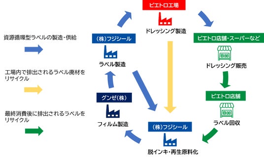 ピエトロ店舗にて回収およびピエトロ工場にて排出のピエトロドレッシングのパッケージラベルを、フジシールが印刷インキを剥離・再生原料化。資源を有効活用し、グンゼが新しいフィルムを製造して、新しいラベルに再生します。