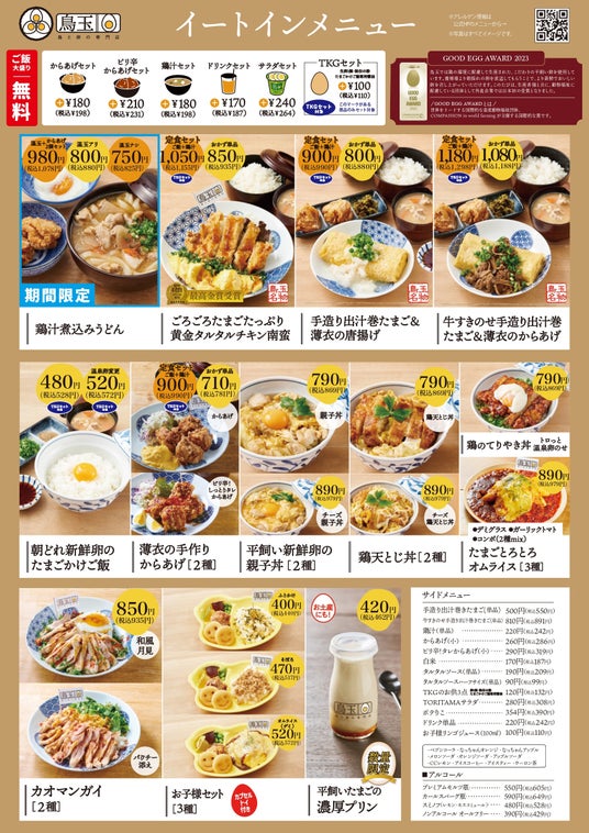看板メニューである「ごろごろたまごたっぷり 黄金タルタルチキン南蛮」は、鳥玉発祥の地である沖縄にて実施された「EGG-1 グランプリ決定戦」第1回で見事「初代グランプリ」に輝いた自慢の逸品
