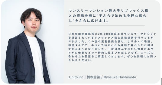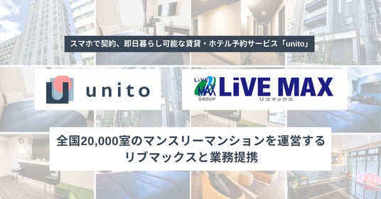 帰らない日は家賃がかからない住まいなど、住む頻度・期間に合わせたお部屋探しができる「unito(ユニット)」を運営する株式会社Unito(所在地:東京都千代田区、代表取締役:近藤佑太朗、以下「Unito」)は、株式会社リブマックス(本社:東京都港区、代表取締役:有山憲、以下「リブマックス」)と業務提携しました。これにより、リブマックスが運営する全国のマンスリーマンション20,000室以上のお部屋を「unito」にて検索、申し込みができるようになりました。