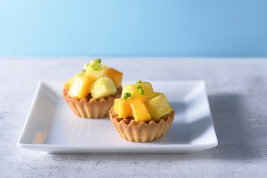 マンゴーとパイナップルのタルトマンゴーとパイナップルの特徴的な甘味と、カルダモンのスパイシーな香りのアクセントを加えタルトに。