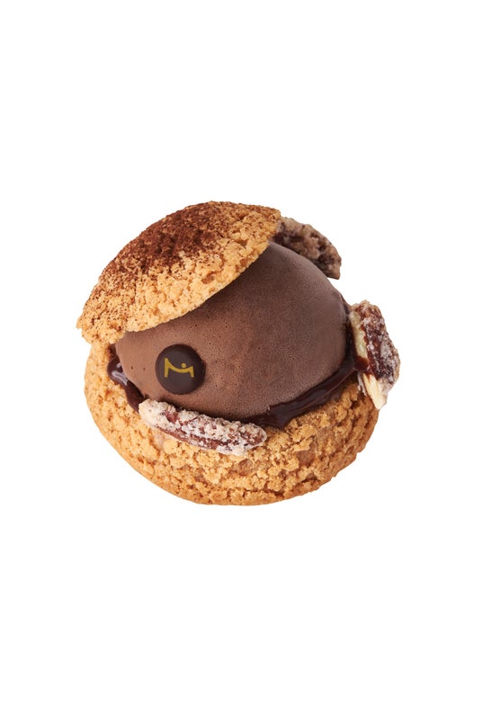 クッキーシューに濃厚なショコラのアイスを挟み、糖衣かけのピーカンナッツとチョコレートソースで仕上げたシューアイス。