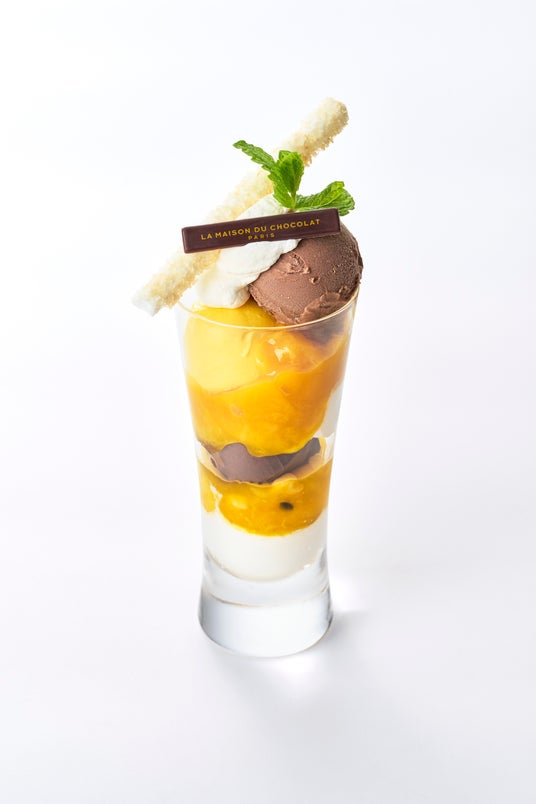 ココナッツ風味のクリーム、パッションフルーツソースとマンゴーに、ショコラのアイスとマンゴー&パッションフルーツ風味のソルベを合わせたパフェ。