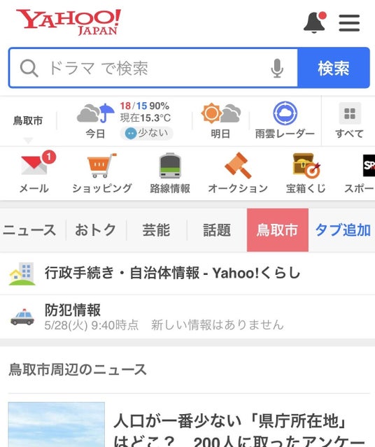 【「Yahoo! JAPAN」 地域タブの表示画面】