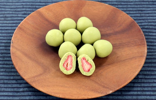 フリーズドライいちごを抹茶のチョコレートで包み込み、一口噛めばいちごの甘酸っぱさと、抹茶チョコレートの甘味とで大変よく合います。