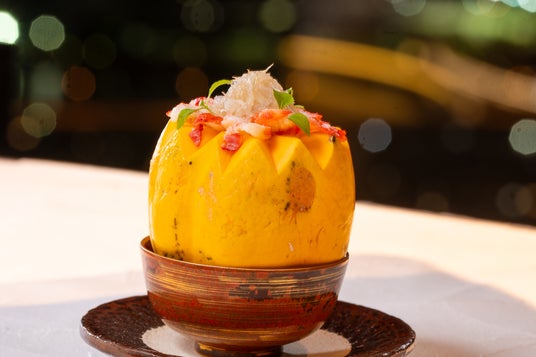 当店シェフが師事している香港の周中氏(しゅうちゅうし)考案のスープ。中身は金華ハムとキヌガサタケが入っており、フカヒレとタラバガニをパパイヤの上に。