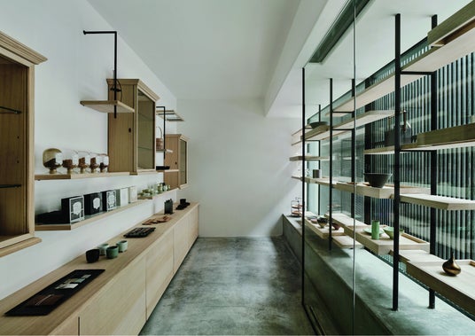 カウンターの諫早石は、古くから貿易の拠点として栄え、幕末から明治にかけて日本茶の輸出が盛んだった長崎において、石畳や石橋などに用いられてきたもの。この諫早石には日本茶を世界へと広めていきたいとの願いが込められています。店内右側のエリアでは陶磁器をはじめ、鐡、錫、銅、 漆、硝子、木、竹など、それぞれの素材がもつ新たな可能性を追求し、日本が誇る伝統技術を用いて製作したさまざまな生活道具のほか、日本では初お披露目となるOGATAならではの香りYOKAとお香の道具を販売いたします。YOKAは伝統的なお香に使われてきた品質のよい天然由来の原料を独自の製法で丁寧に調合した香りです。