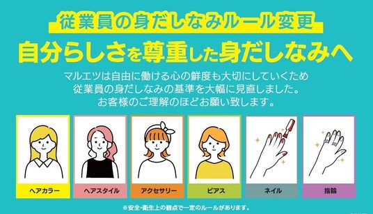 マルエツは、従業員一人ひとりが個性を発揮し、自分らしくいきいきと働ける職場環境づくりの一環として、6月1日(土)から、勤務時における従業員の身だしなみ基準を大幅に見直しいたします。