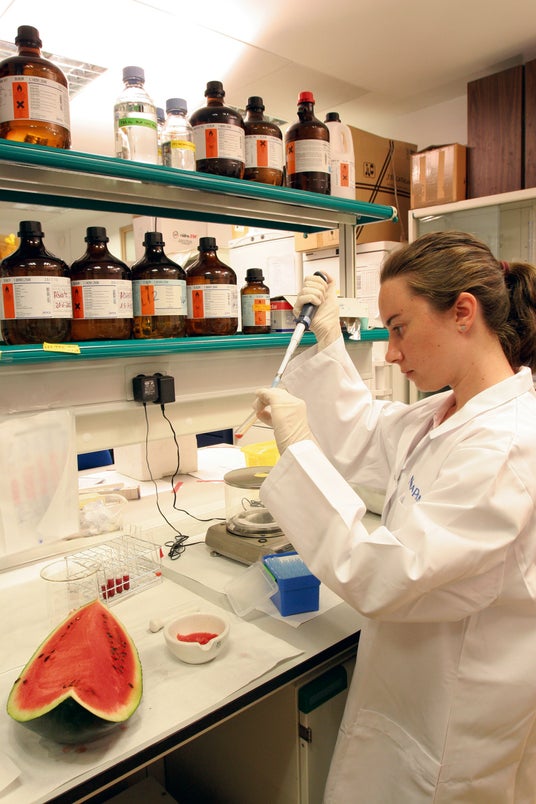 スイカの有用成分を調べるニナファームの科学者